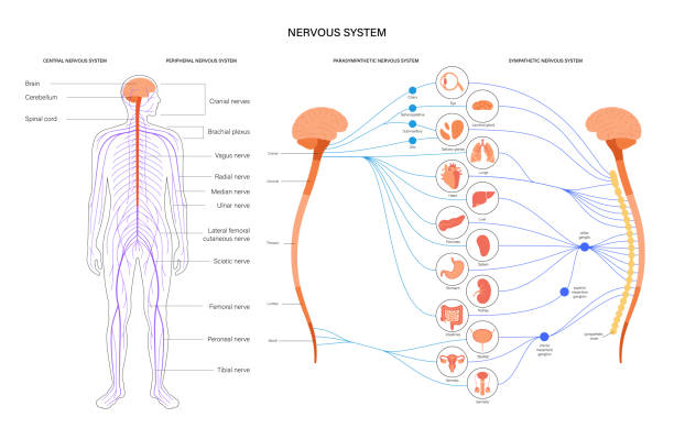 Sympathetic and parasympathetic nervous systems. Diagram of brain and nerves connections. Autonomic nervous system infographic poster. Spinal cord and internal organs in human body vector illustration